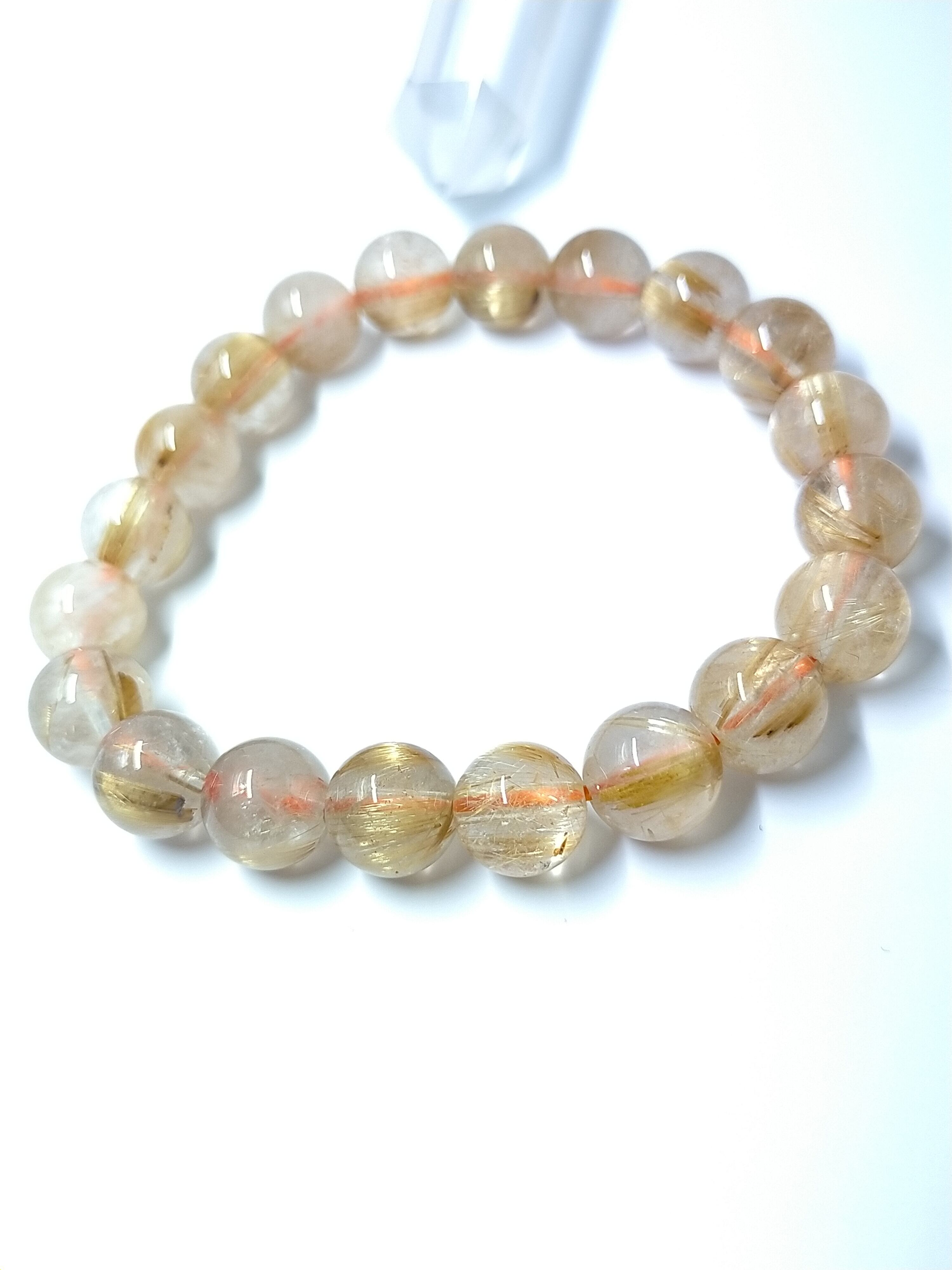 女性に丁度良い大きさである9.5mm珠の、丁度良いクオリティなルチルのみを巻いたブレス一本目にオススメしたいお品です。割と金針もしっかり入っているので良運を齎してくれるでしょう。