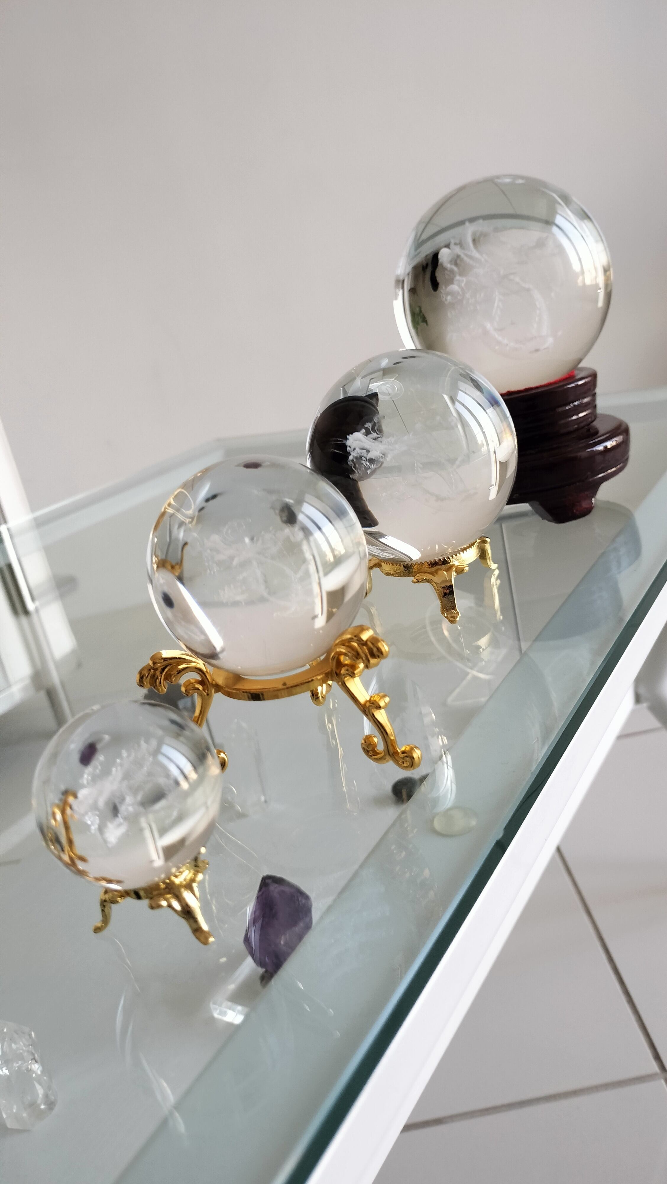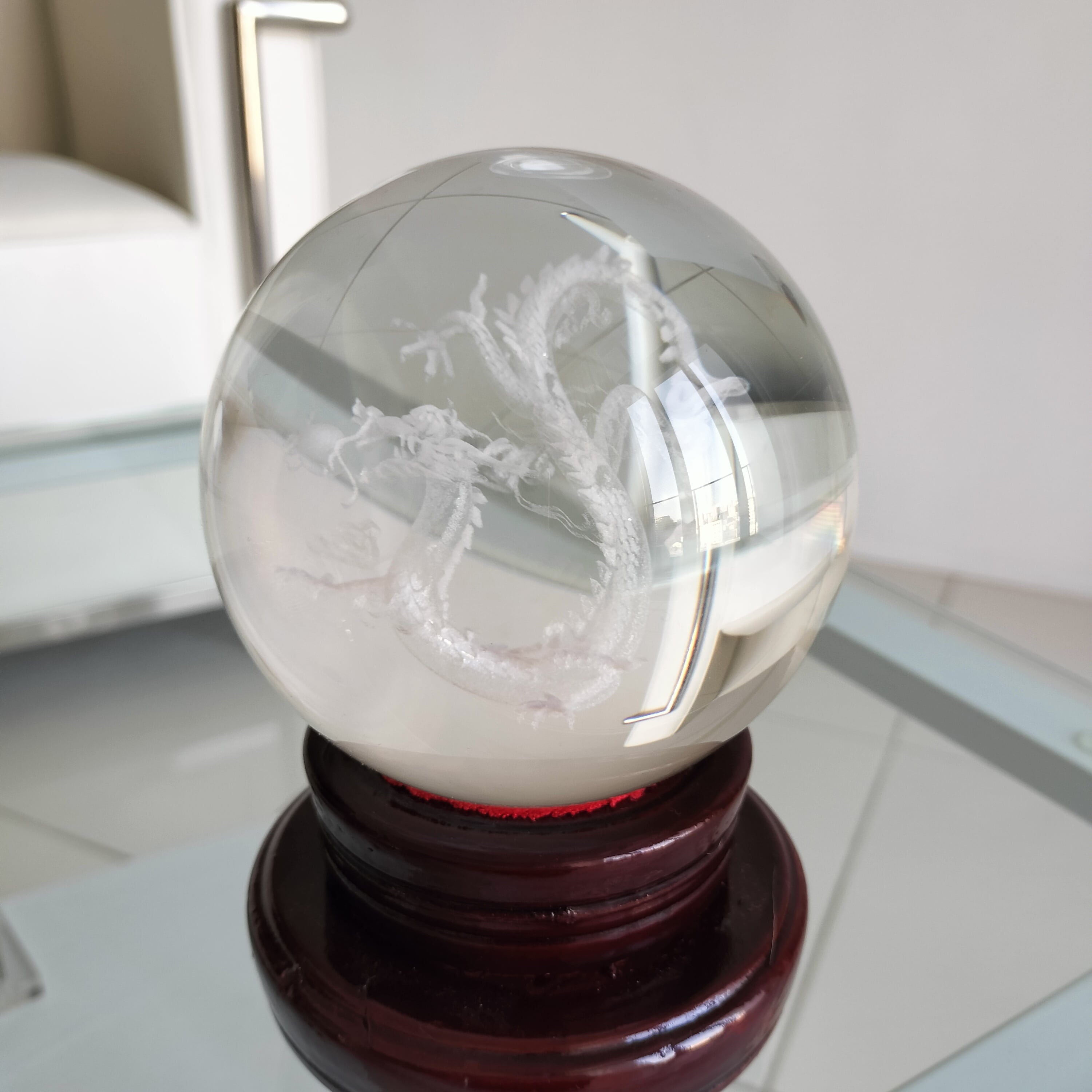 レーザーで彫るため素材はガラス珠となりますが、3Dで彫られた龍は精巧で、まるで丸珠の中に龍が飛翔しているかの様