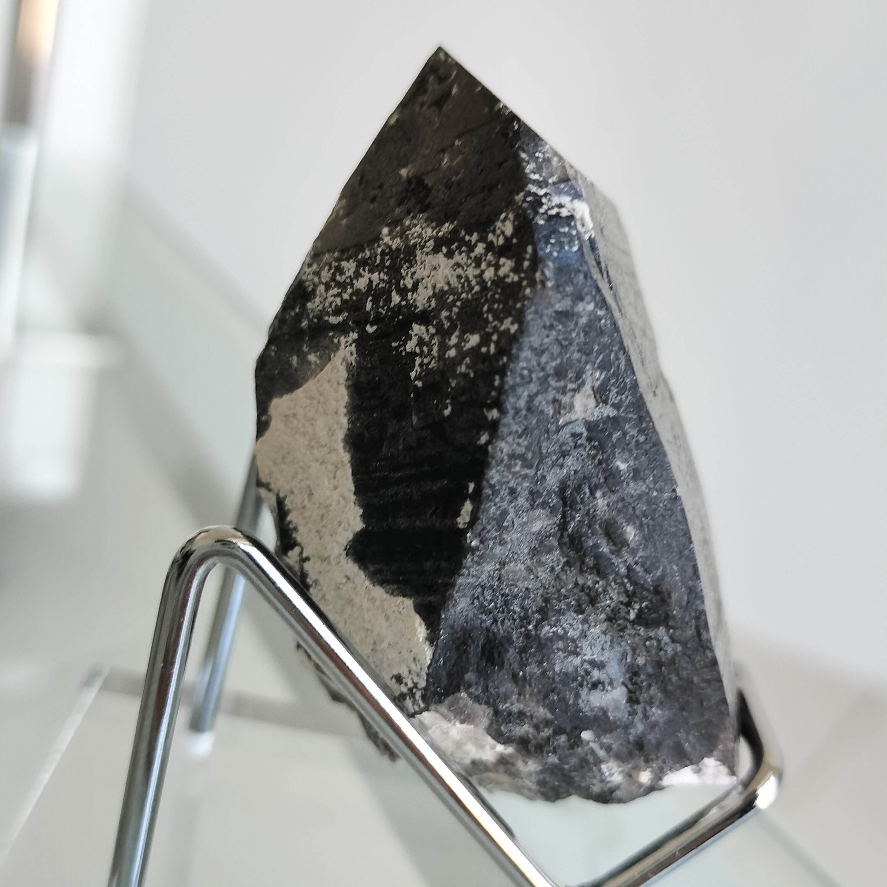その黒色と光沢のある表面が特徴、結晶は六角形の柱状や錐状をしています。