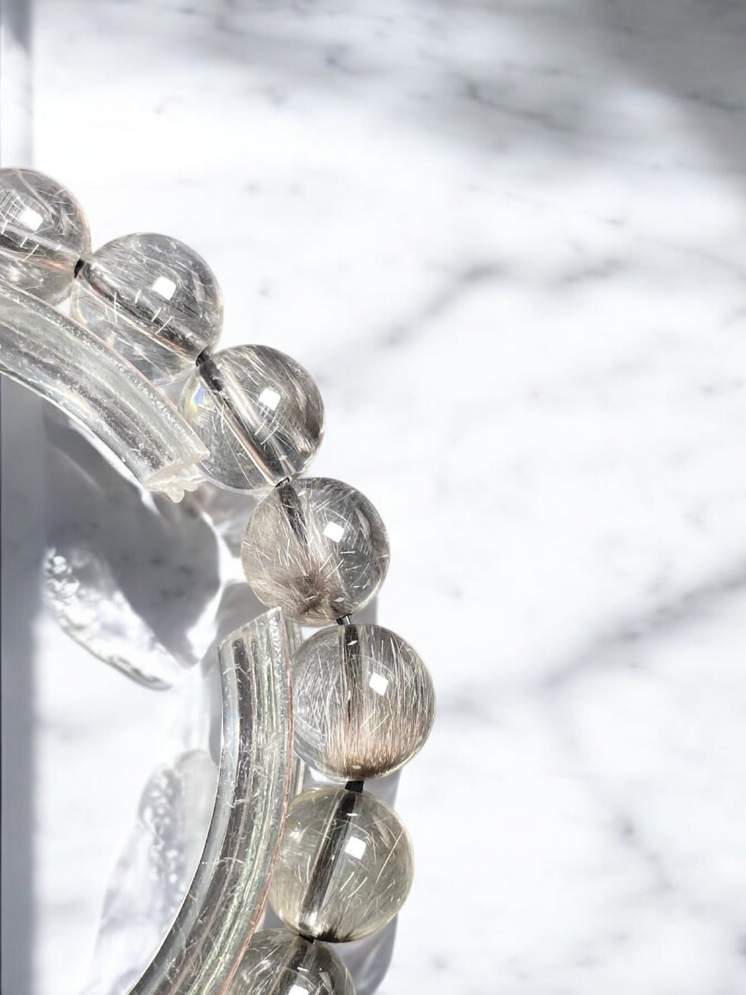 黄金の輝きを放ち華やかさのあるゴールドカラーのルチルクォーツとは対極に、静かで落ち着いたモノトーンのプラチナルチルクォーツ。
