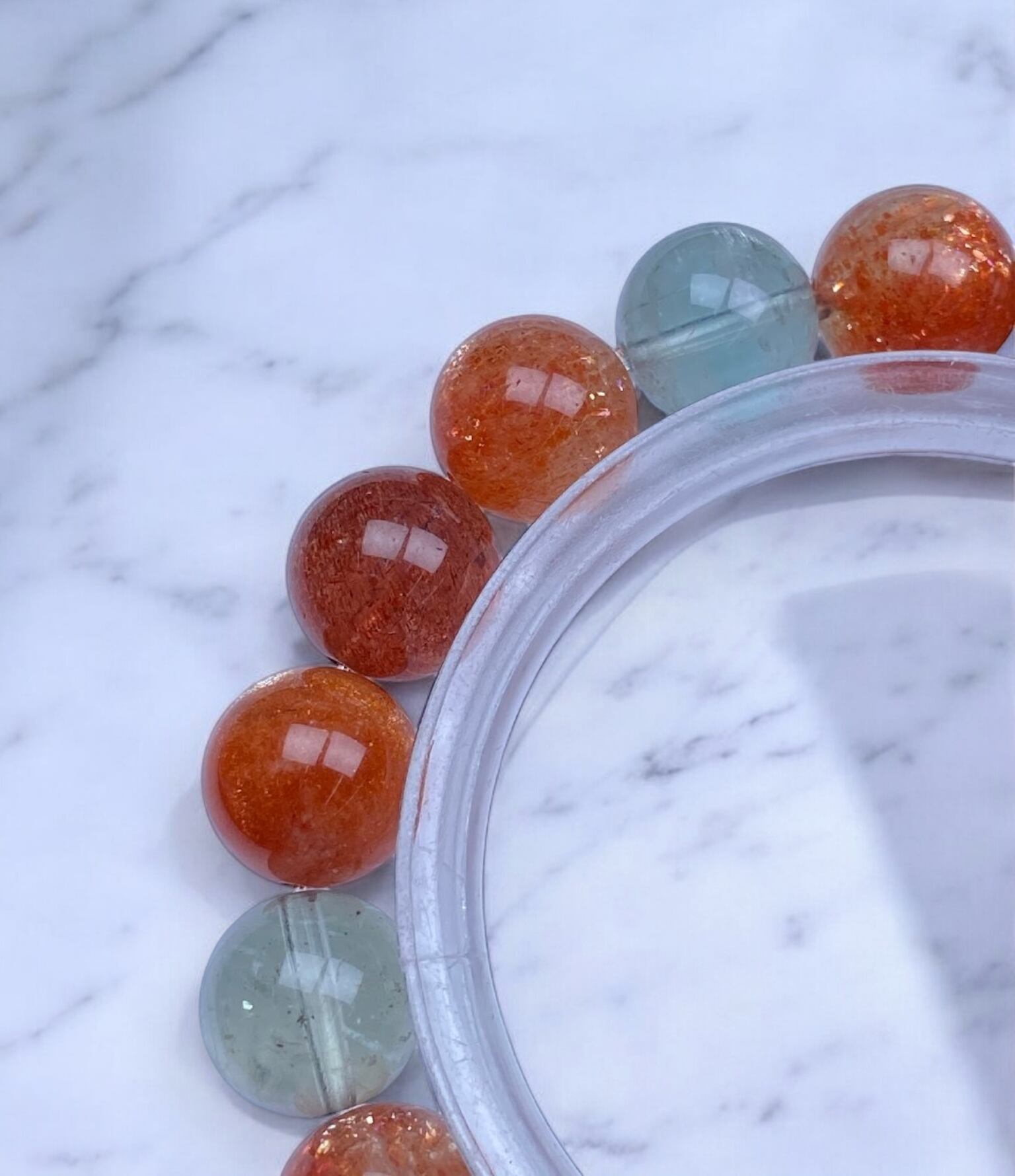 別名アクアマリンサンストーンとも呼ばれており、オレンジ、白、グリーン、ブルーなど色とりどりの色彩をもつ非常に珍しいサンストーンです。